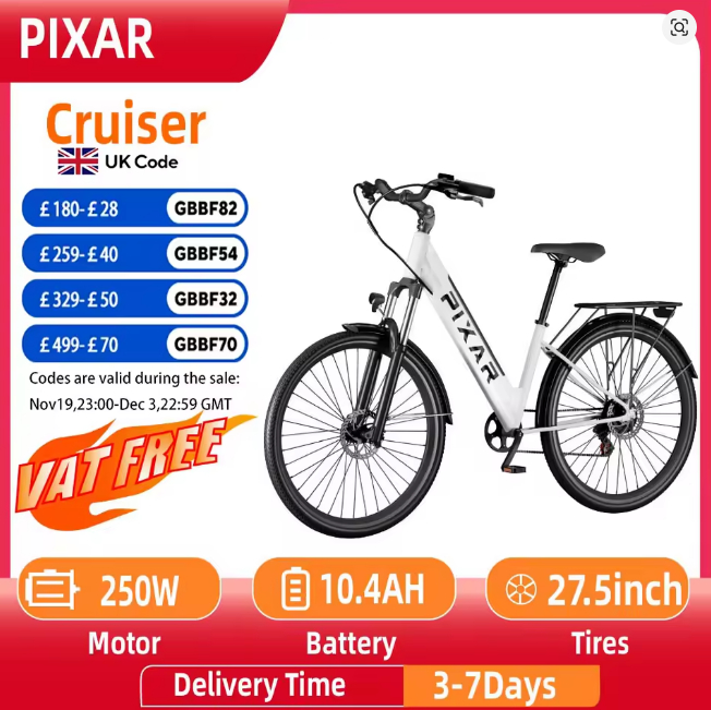 The PIXAR Cruiser 250w Adult Ebike is designed for urban commuters and casual riders seeking an affordable, reliable, and stylish electric bike.